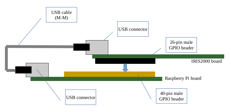 Being backward compatible, the board mates with first 26 pins of GPIO while for audio interface, a M-M USB type A cable is used to connect IRIS2000 USB port to one of USB ports on Raspberry Pi as shown below.