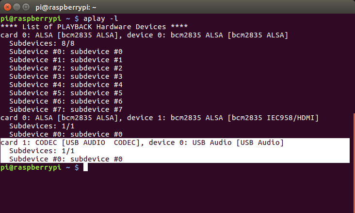 Once these libraries are installed, you can run demo firmware but before you do that, check mapping of USB audio device using aplay -l: