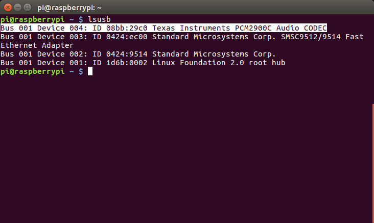 The entry with PCM2900C is the entry you are looking for. If you don’t see such an entry, make sure USB cable is connected correctly, is not faulty and that you are using a high quality USB power supply as USB devices are not detected if power supply is noisy.